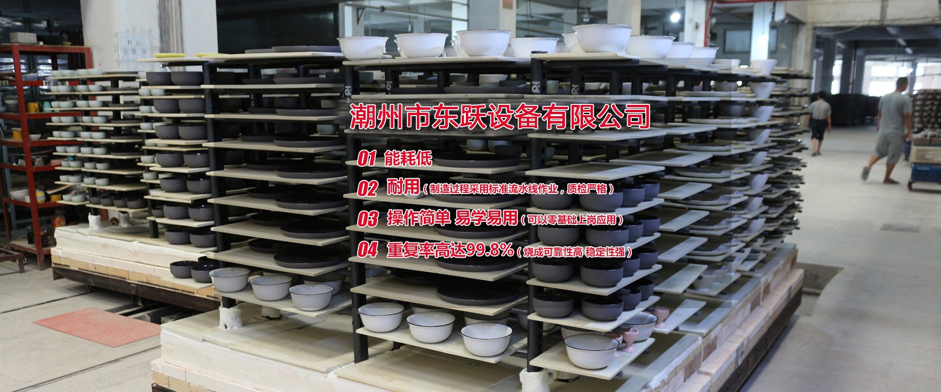 潮州市東躍設(shè)備有限公司,創(chuàng)立于公元2011年5月14日,經(jīng)過進(jìn)十年的努力,已發(fā)展成一家擁有集研發(fā)、設(shè)計、加工制造、安裝、調(diào)試與售后一體化的窯爐公司。設(shè)計理念:1.能耗低2.耐用(制造過程采用標(biāo)準(zhǔn)流水線作業(yè),質(zhì)檢嚴(yán)格)3.操作簡單 易學(xué)易用(可以零基礎(chǔ)上崗應(yīng)用)4.重復(fù)率高達(dá)99.8%(燒成可靠性高 穩(wěn)定性強(qiáng))   現(xiàn)有設(shè)計人員10名,加工制造和安裝人員約100人,調(diào)試人員10人,售后服務(wù)人員10人,公司總?cè)藬?shù)約200人。公司本著以人為本的發(fā)展策略,不斷網(wǎng)絡(luò)人才,發(fā)展自動化窯爐技術(shù)。